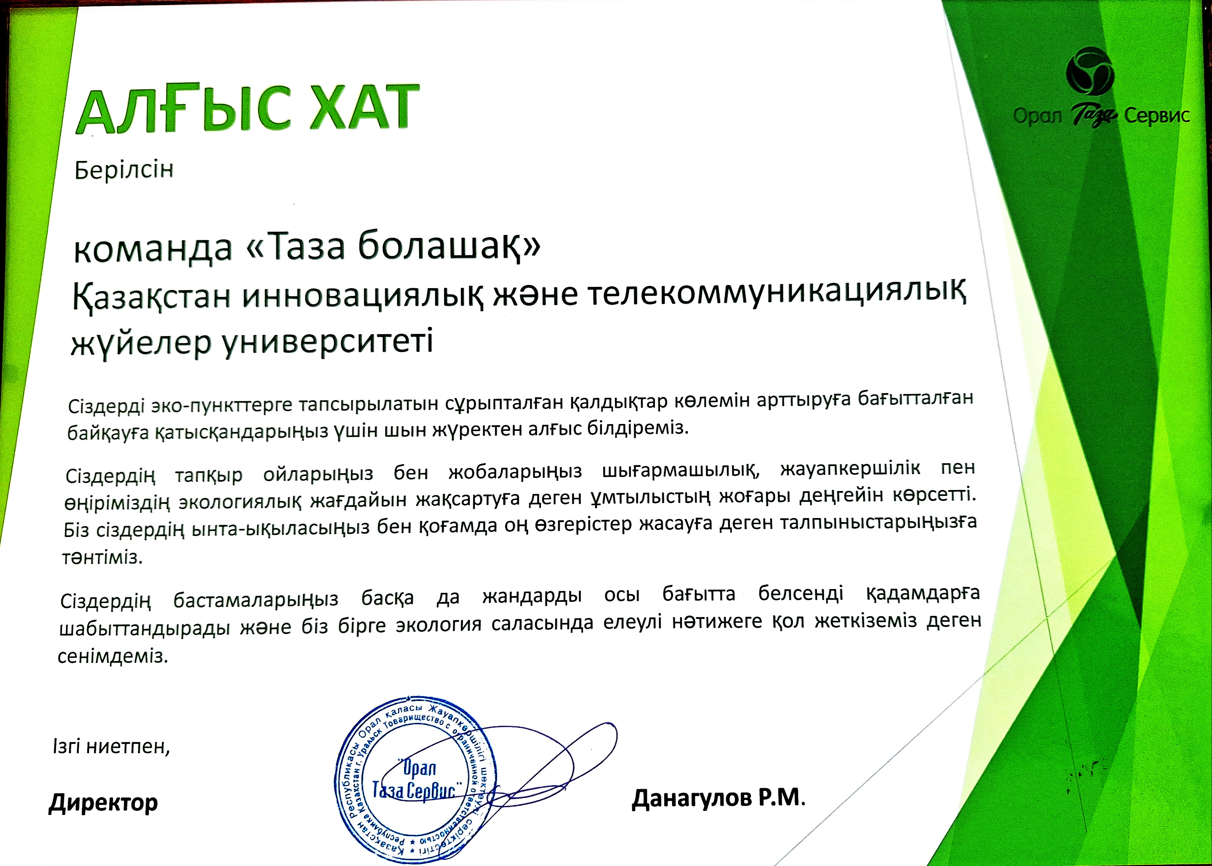 19 мая 2025 года на базе ЗКАТУ им. Жангир хана состоялся второй тур конкурса, в котором приняли участие 13 бизнес-проектов. Соревнование отличалось высокой интеллектуальной конкуренцией. По завершении конкурса прошло торжественное награждение участников. В нелёгкой борьбе команда «Таза болашақ» была отмечена благодарственным письмом за активное участие и вклад в развитие экологических инициатив.