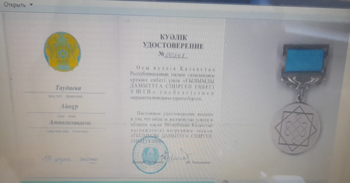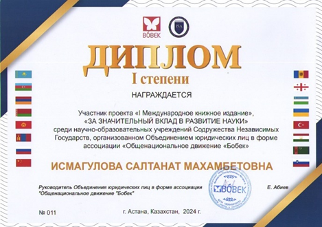 Кафедрамыздың ак.доценті Исмагулова Салтанат Махамбетовна Қауымдастығы нысанында заңды тұлғалар бірлестігінің «Бөбек» Жалпыұлттық қозғалысының» ұйымдастырған академик Қаныш Сәтбаевтың 125 жылдығына арналған "ҒЫЛЫМНЫҢ ДАМУЫНА ҚОСҚАН ЕЛЕУЛІ ҮЛЕСІ ҮШІН" халықаралық жобасына қатысып, 1 дәрежелі диплом, қатысушы куәлігі және медалінің иегері атанды.